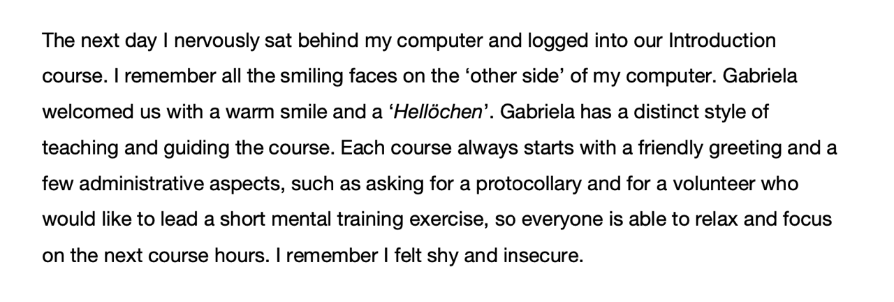 Es war mir eine Ehre und ein Privileg, von Gabriela Schildbach zu lernen, und ich bin dankbar für die Zeit und Mühe, die sie in meine Ausbildung investiert hat. Ich werde die wertvollen Lektionen und Einsichten, die ich durch ihre Anleitung gewonnen habe, stets in Erinnerung behalten.