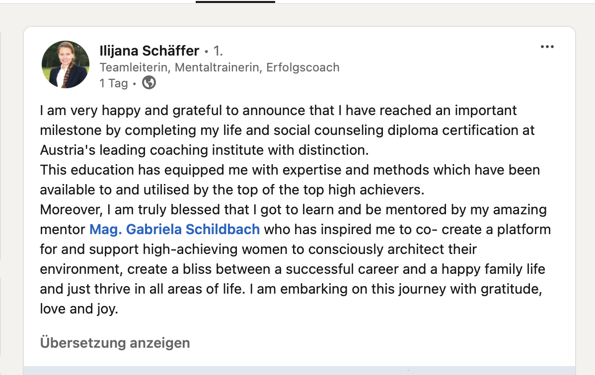 Im Alleinstellungsmerkmal erwähnen möchte ich Frau Mag. Gabriela Schildbach. Durch ihren Geist, ihr Wirken und Sein, war meine Entwicklung wieder ein Stück mehr möglich. Sie hat mich unterstützt in meinem Wachstum, nach meinem Tempo und meinen Möglichkeiten. Sie hat mich über die Dauer von zweieinhalb Jahren, die Zeit versüßt, mich aus meiner Wohlfühloase gelockt, zum Schweigen und Nachdenken ermuntert, innehalten in Liebe wie ich es gerne nenne und wieder zum Weitermachen, Aufstehen, Durchziehen motiviert, wenn’s mal streng war und ich den Mut verlor. Die wertvollsten Ergebnisse habe ich durch ihre Interventionen erzielen können, da sie auf geniale Art und Weise mich meiner eigenen Wahrheit nähergebracht haben und ich meine Handlungen dadurch überdenken, verändern oder ausführen konnte.